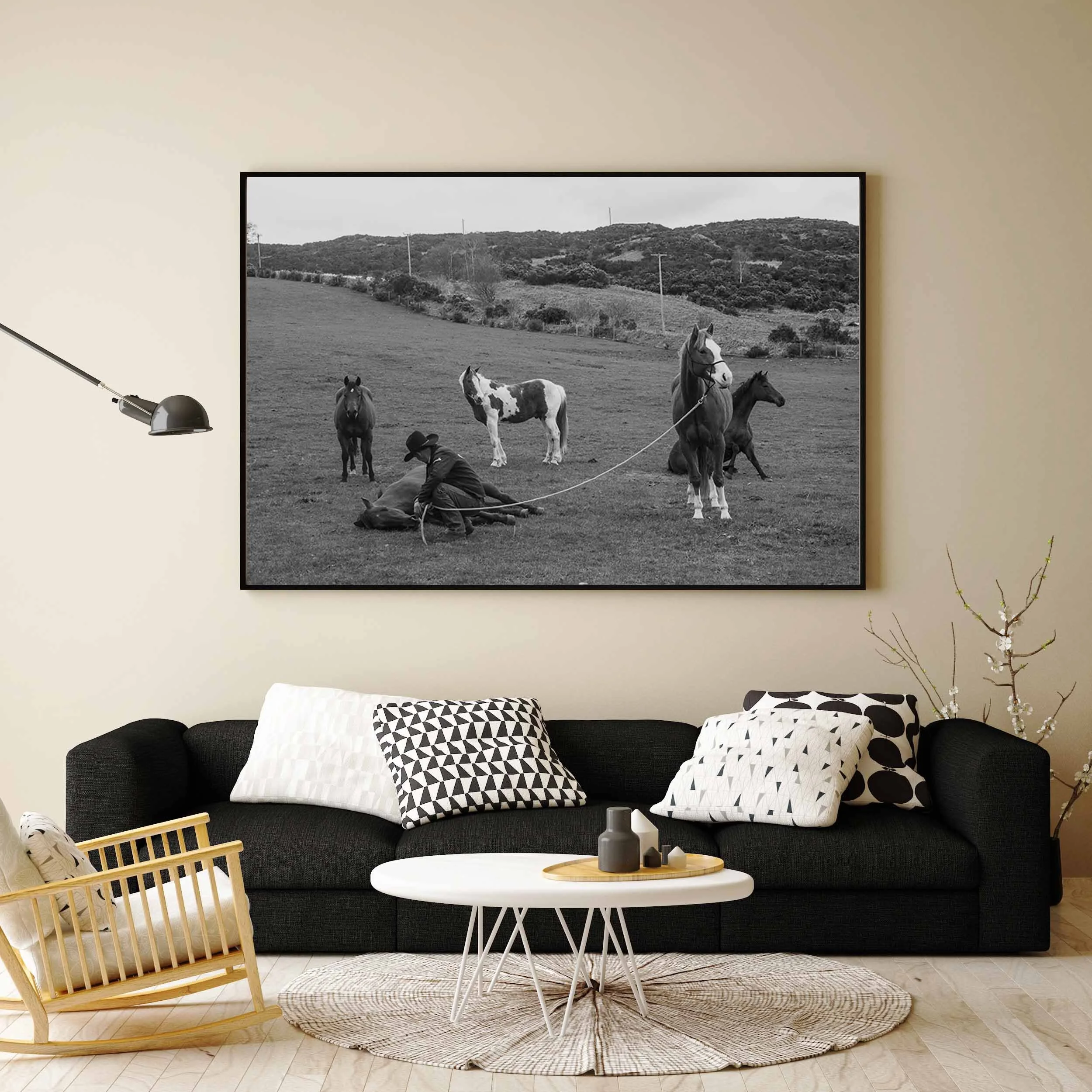 Released as Editions of 5, these high quality black and white fine art prints taken in a photojournalistic, documentary approach and are a close up and inspection of the horse-human relationship. The artists purposefully uses animals and humans in their natural environment to highlight the vulnerability of the subject and topic matter, giving one a macro perspective on the animal. Finishing off with a full bleed print with black ash wood framing, the subtle textures and grain of the frame complements the print beautifully.
